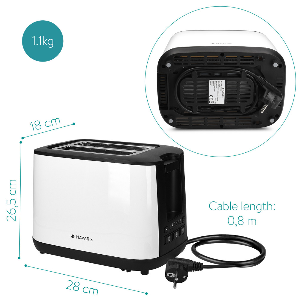 Toaster Navaris 2 felii, 1000W, reglaj rumenire, functie reincalzire, alb, plastic