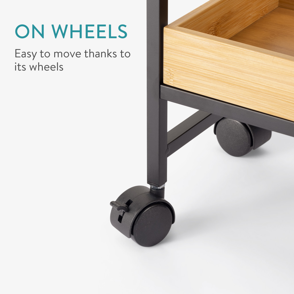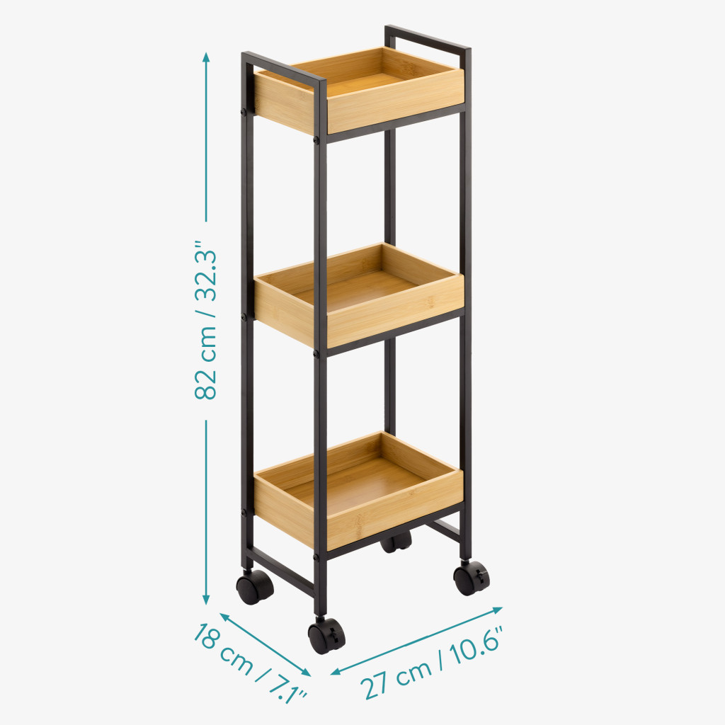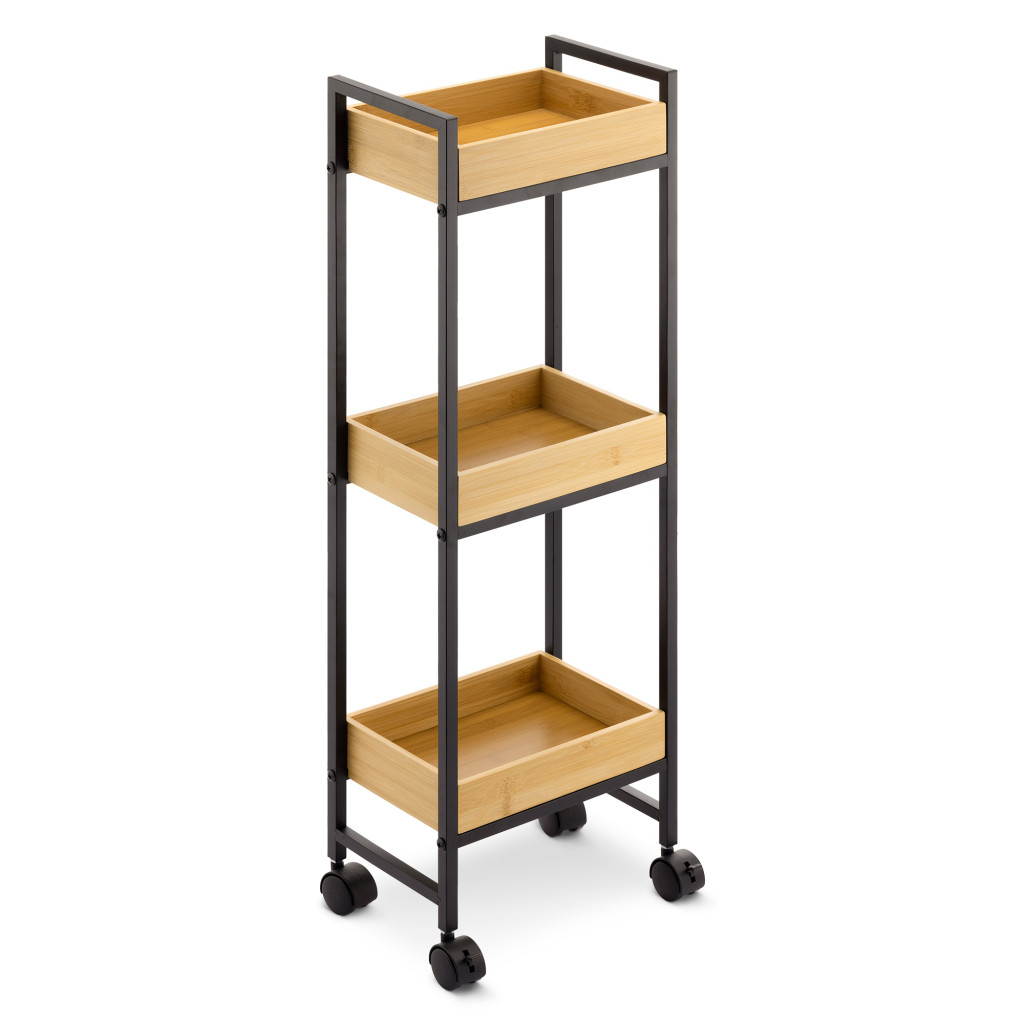 Raft baie Navaris cu roti, 3 rafturi, 27x18x82 cm, mobil si ingust, maro/negru, bambus