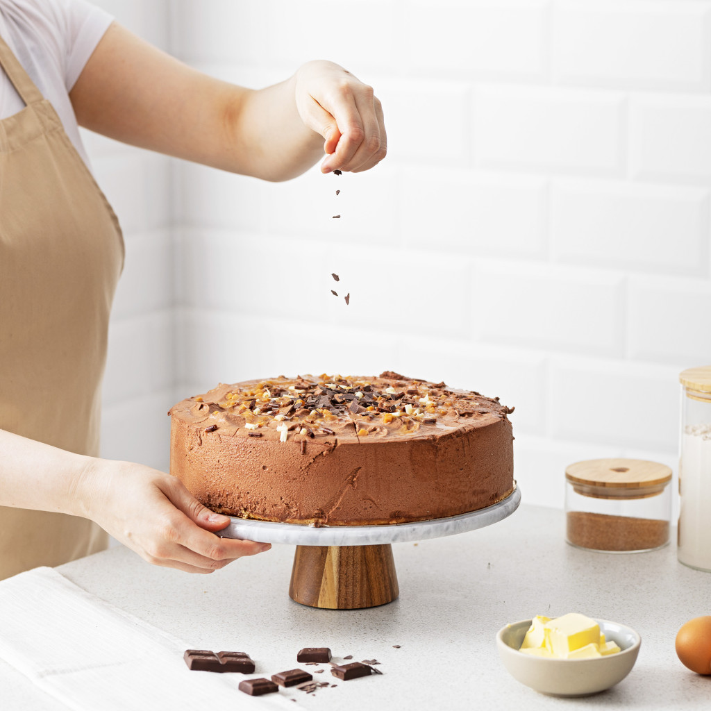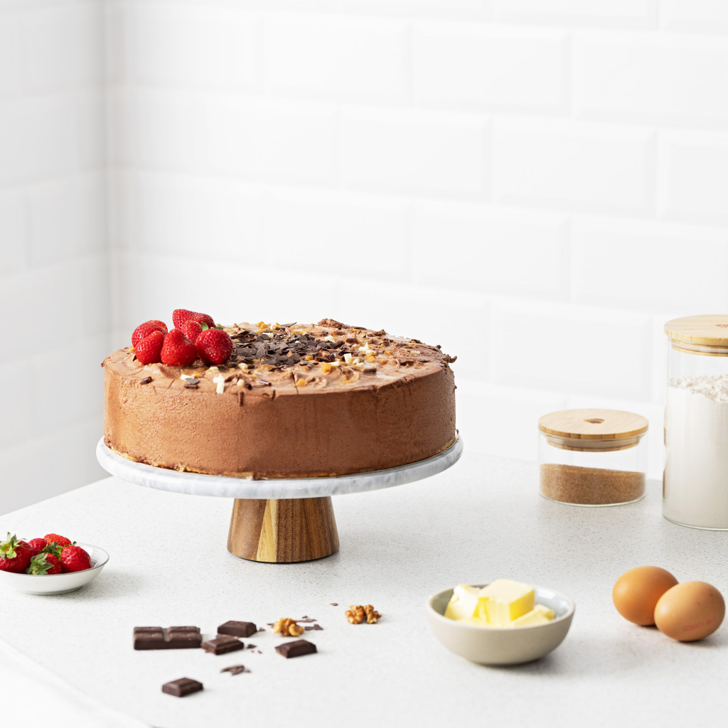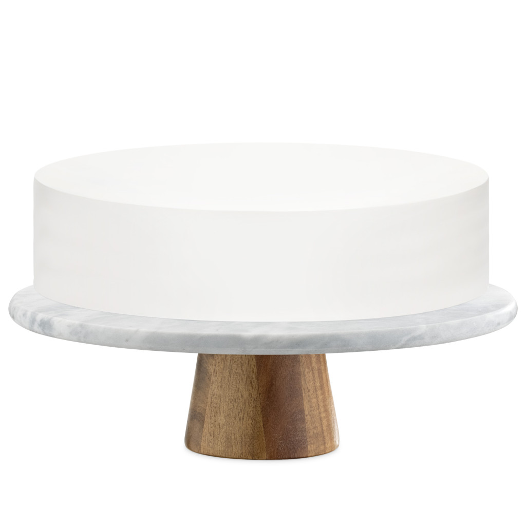 Suport tort rotativ Navaris, 30 cm, baza lemn acacia, decorare si servire, marmura/lemn, alb, lemn