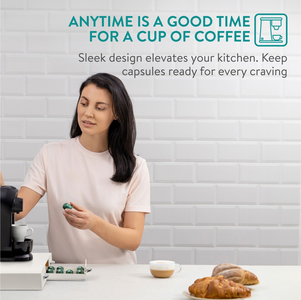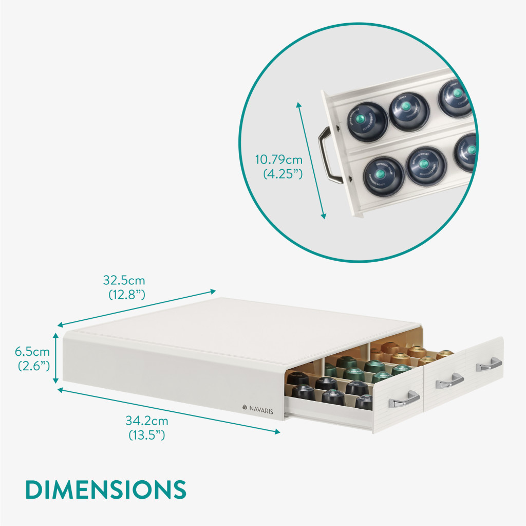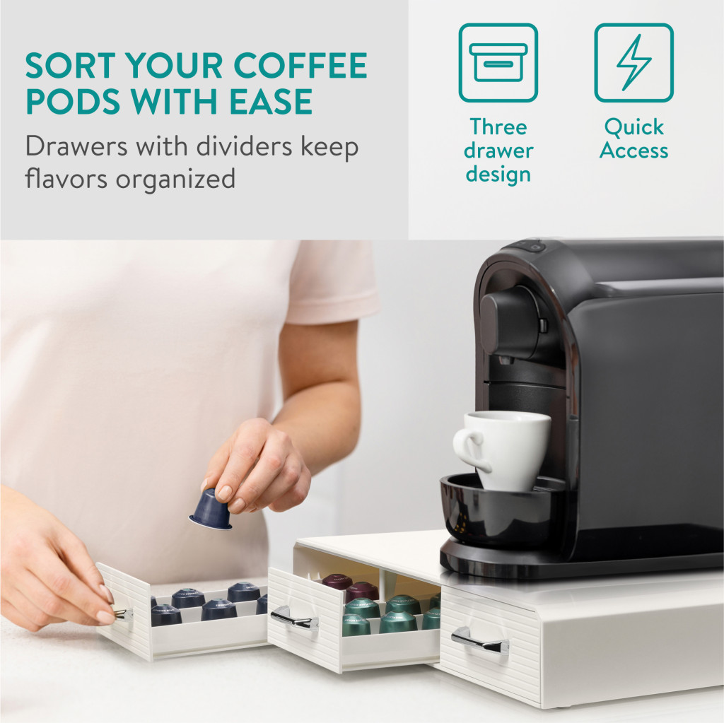 Organizator capsule cafea Navaris, 3 sertare, 48 capsule, 34.2x6.5x32.5 cm, alb, plastic