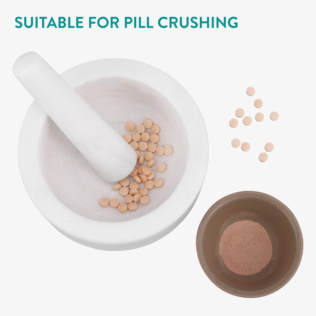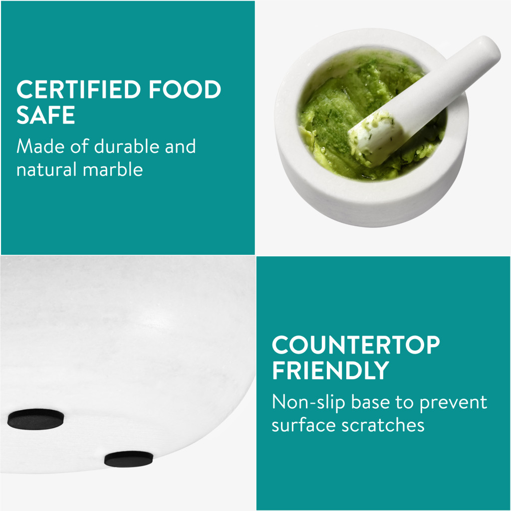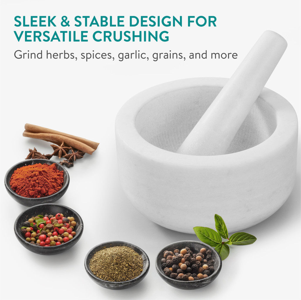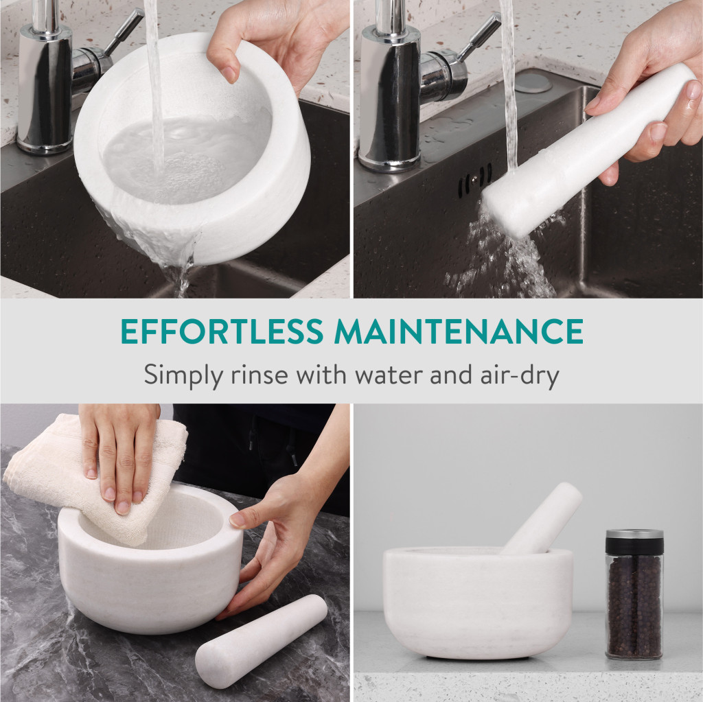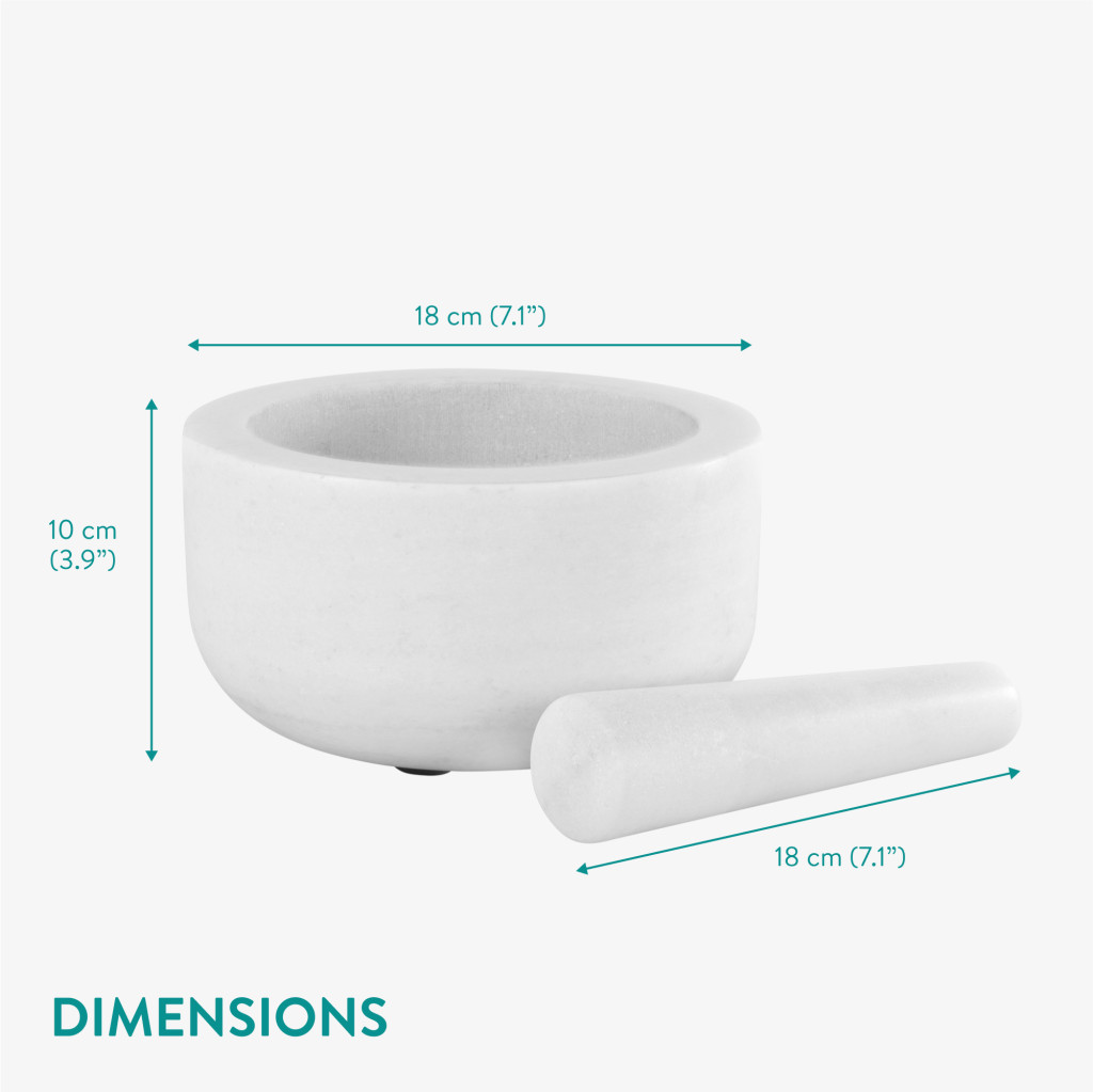 Set mojar si pistil Navaris, 18 cm, marmura alba, baza antiderapanta, 4 cup, alb, piatra naturala